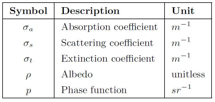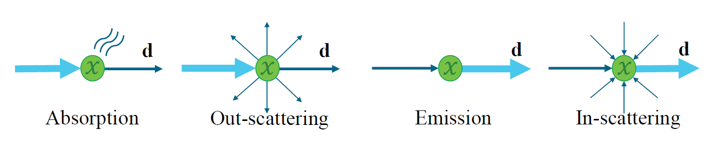 在参与介质的影响下,光在传播过程中的辐射度不再保持不变,某点的入射辐射度可以根据以下等式描述为(假设光源是无穷小的点光源):