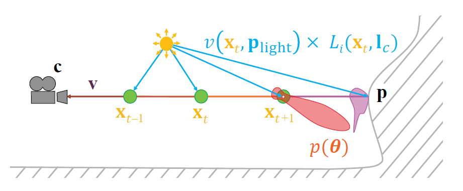 Li(c,−v)=Tr(c,p)Lo(p,v)+∫t=0∥p−c∥Tr(c,c−vt)Lscat(c−vt,v)σsdt