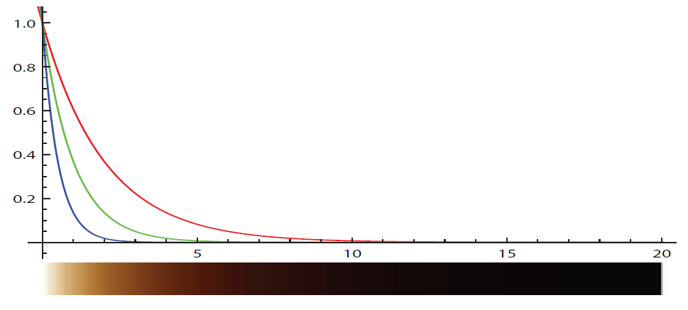 考虑 σs=(0.5,1,2) 和 σa=(0,0,0),当在介质中传播距离较短时,透射率 Tr≈1,此时散射事件将占据主导,材质将显示为蓝色;而当光越深入介质越少的光子可以通过,此时透射颜色将占据主导,材质将显示为红色。