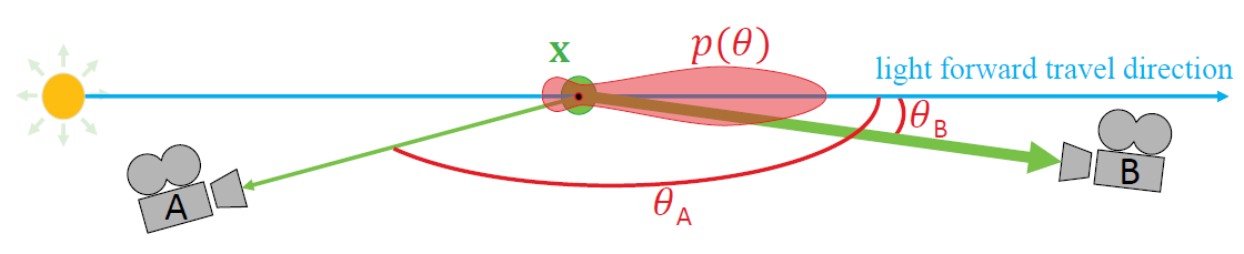 一种常用的相位函数是 Henyey-Greenstein (HG),该函数可以很好地匹配朝向主要散射方向的部分,可以被用于表示烟、雾、尘埃等介质。这种介质可以表现出强烈的后向或前向散射,从而在光源周围产生较大的视觉光晕,例如雾气中的聚光灯以及太阳方向云层边缘强烈的银边效应。